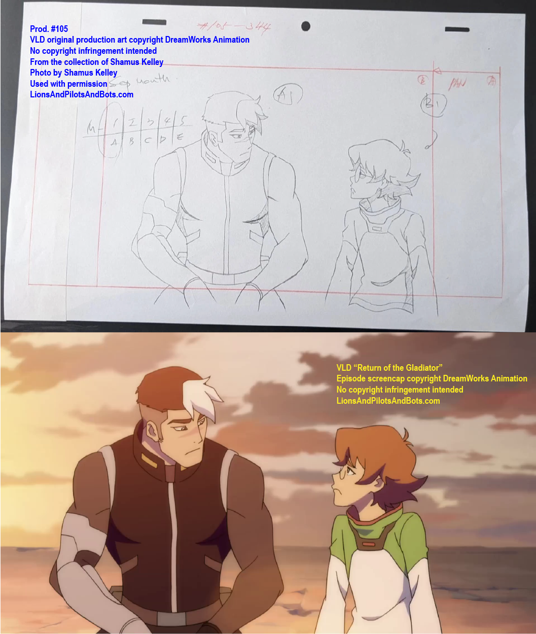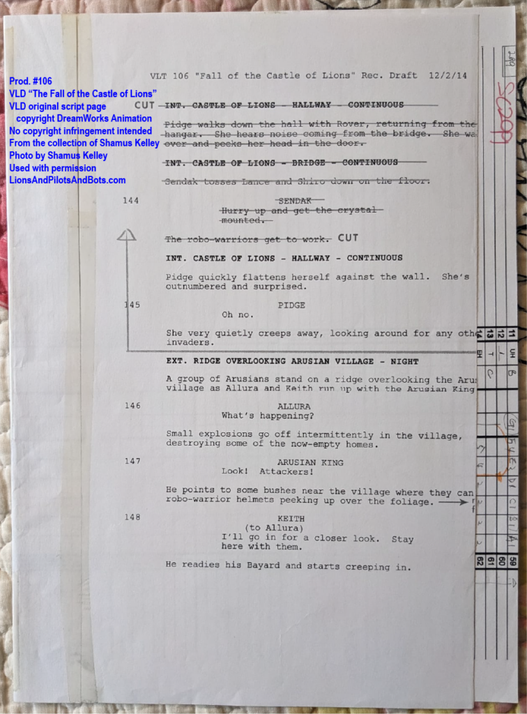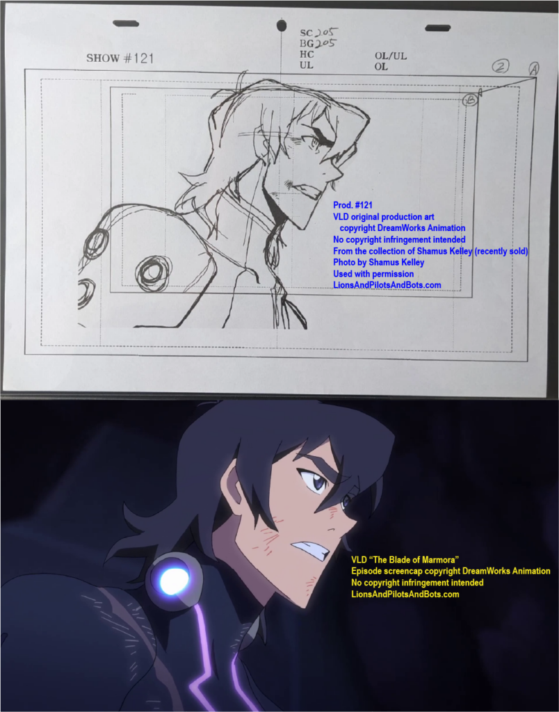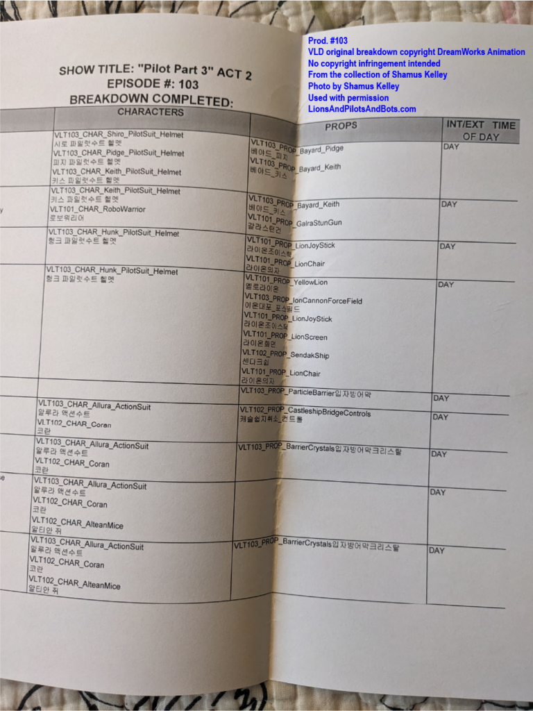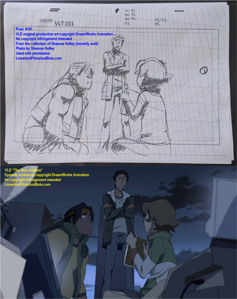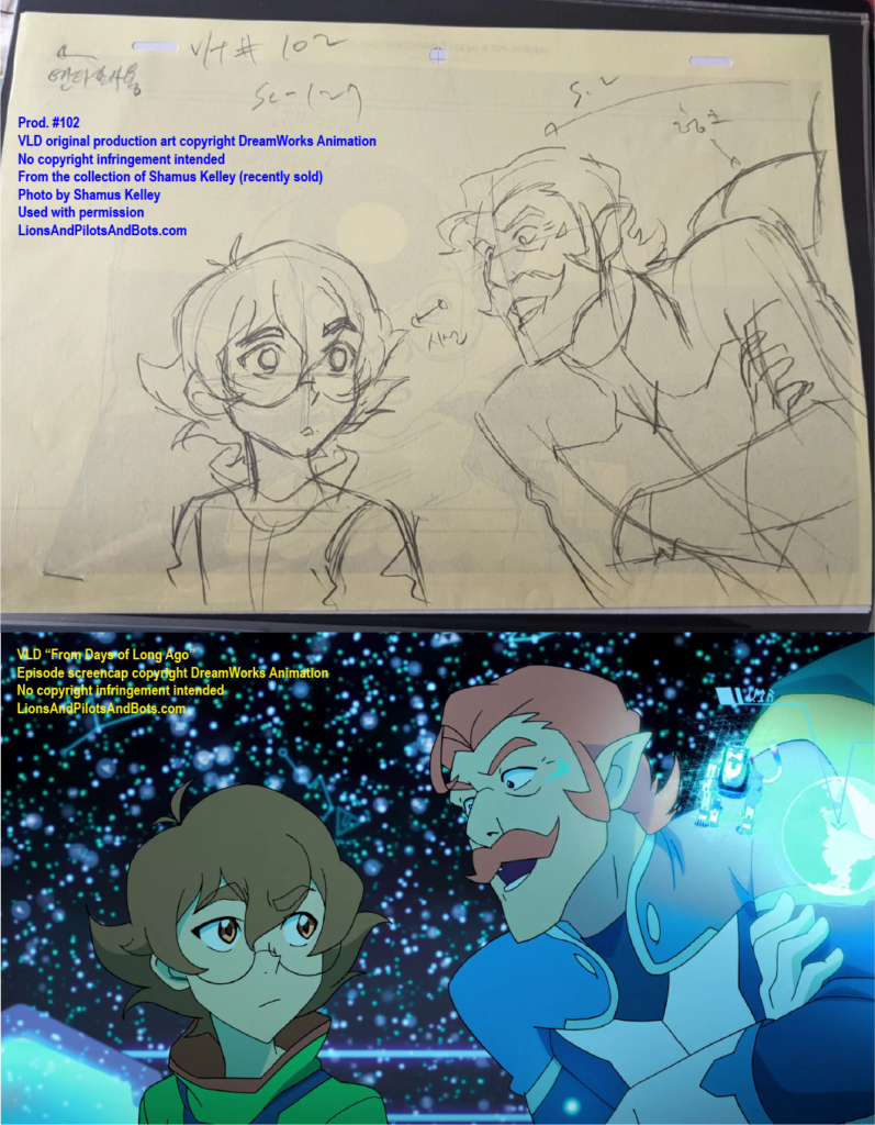The second source of VOLTRON: LEGENDARY DEFENDER production numbers was not a podcast, but rather a person: writer Shamus Kelley. Shamus is perhaps best known for his writing for Den of Geek. He also hosts RoboSkullCast: A Robotech Podcast with his friend Nick. I met Shamus in person at WonderCon 2017, and Shamus has been a guest in mulitple episodes of Let’s Voltron: The Official Voltron Podcast. Shamus is kind, insightful, and witty, and under circumstances that have to be read to be believed, Shamus acquired a collection of VOLTRON production art and related materials from some episodes of the show’s first two seasons. Shamus generously mailed some of the production art to me, and more recently he has begun to list pieces from his own collection for sale on Ebay. Shamus shared photos of some of his VOLTRON production art and materials, and analysis of those photos has revealed the production numbers of several episodes. Over time I’ll analyze more photos from his collection, as well as art from my own collection, in hopes of learning even more episodes’ production numbers.