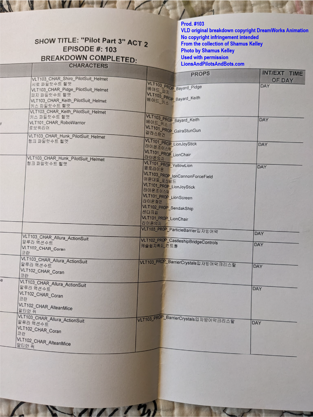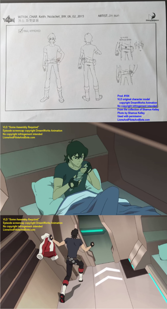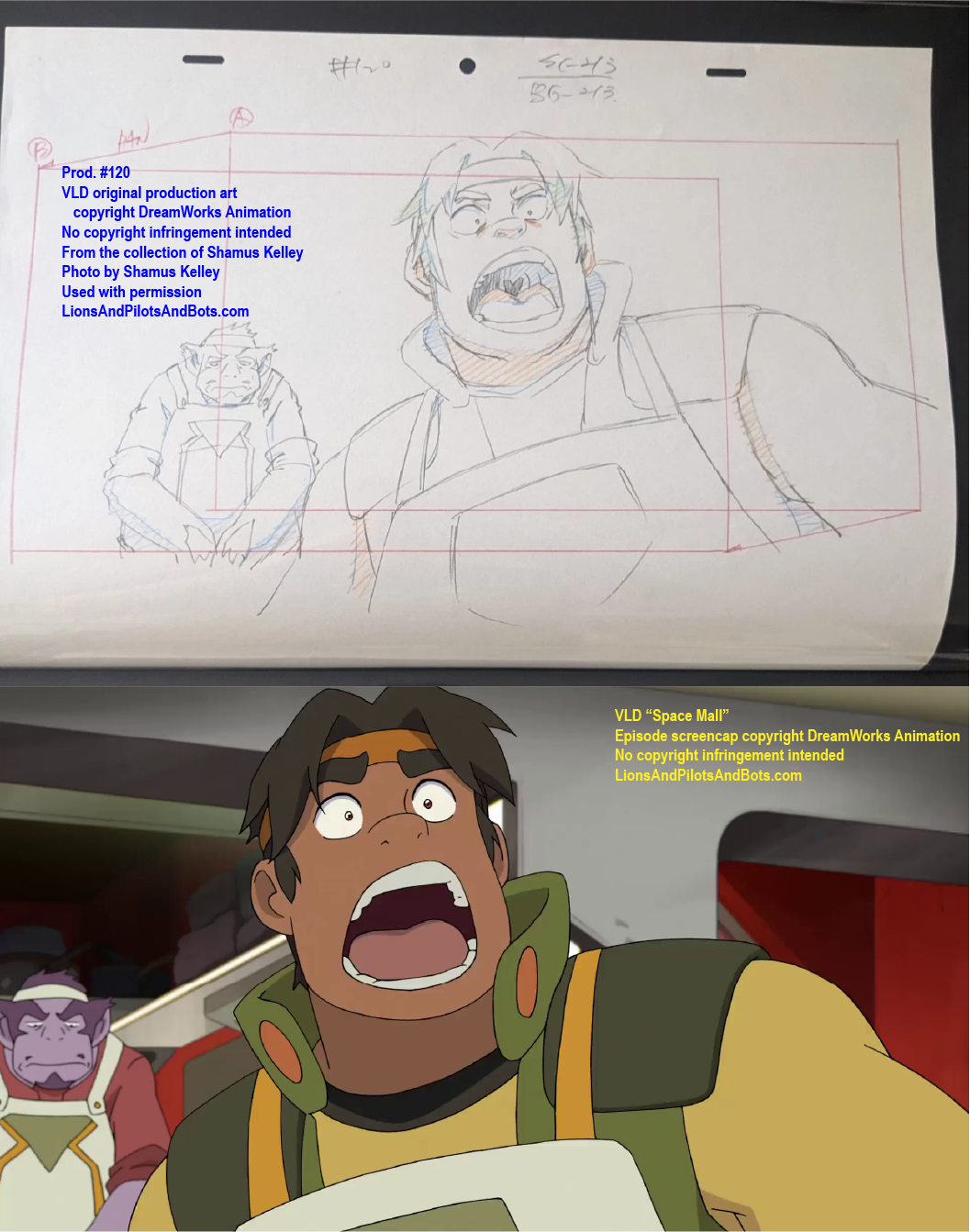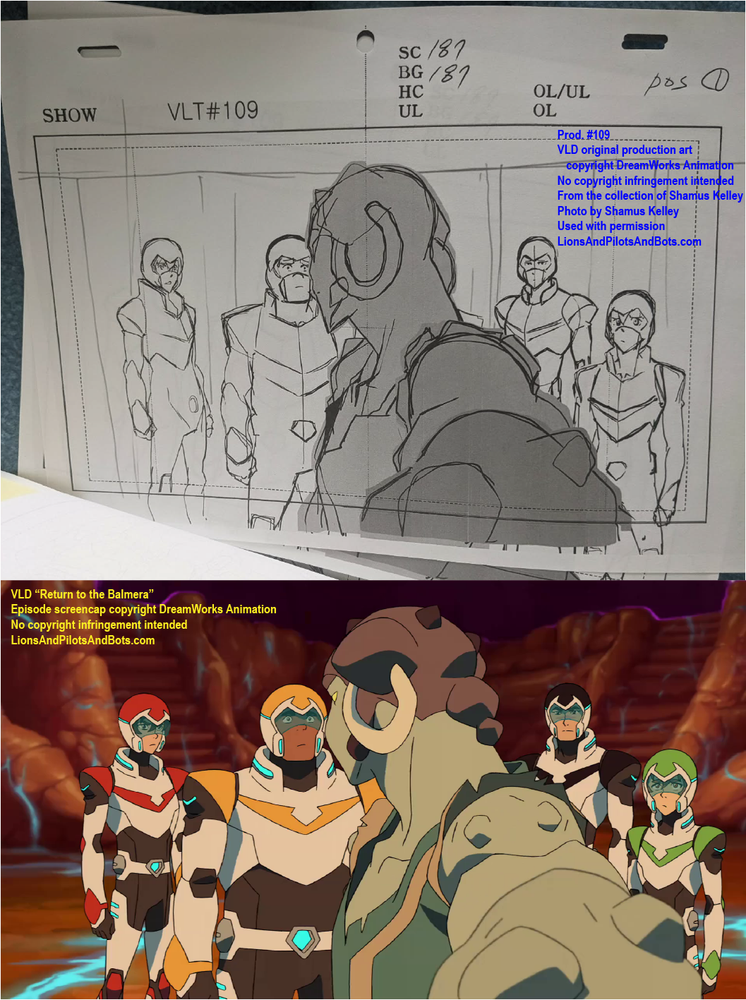 The second source of VOLTRON: LEGENDARY DEFENDER production numbers was not a podcast, but rather a person: writer Shamus Kelley. Shamus is perhaps best known for his writing for Den of Geek. He also hosts RoboSkullCast: A Robotech Podcast with his friend Nick. I met Shamus in person at WonderCon 2017, and Shamus has been a guest in mulitple episodes of Let’s Voltron: The Official Voltron Podcast. Shamus is kind, insightful, and witty, and under circumstances that have to be read to be believed, Shamus acquired a collection of VOLTRON production art and related materials from some episodes of the show’s first two seasons. Shamus generously mailed some of the production art to me, and more recently he has begun to list pieces from his own collection for sale on Ebay. Shamus shared photos of some of his VOLTRON production art and materials, and analysis of those photos has revealed the production numbers of several episodes. Over time I’ll analyze more photos from his collection, as well as art from my own collection, in hopes of learning even more episodes’ production numbers.