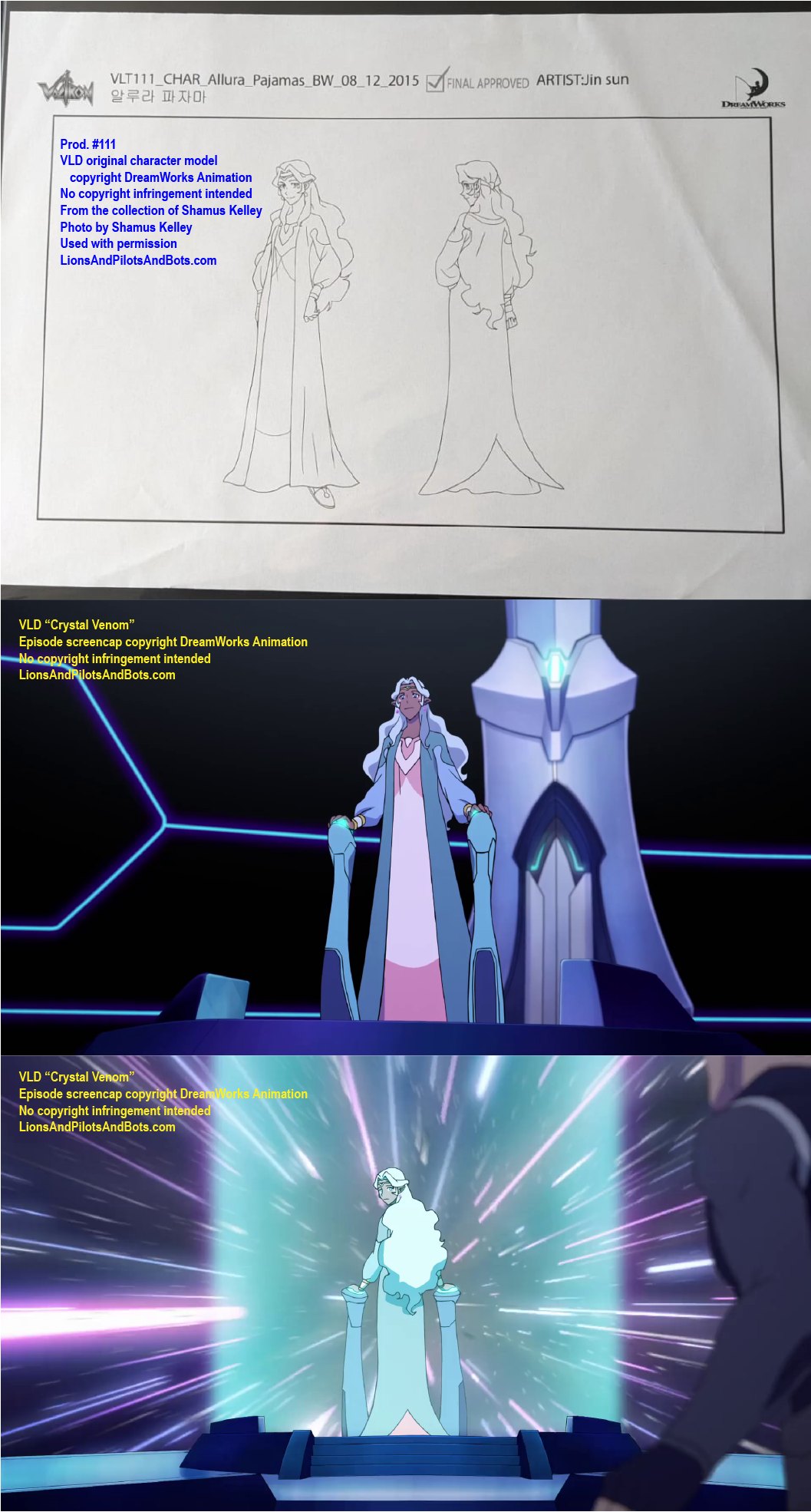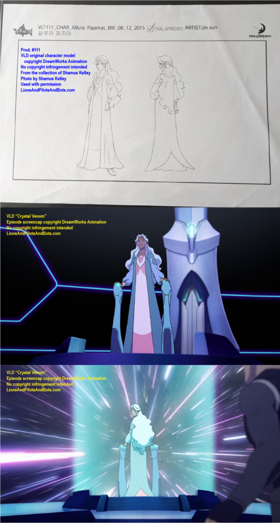 • Episode 1 featured guests Joaquim Dos Santos and reviewed “The Rise of Voltron.” This podcast episode also revealed that “The Rise of Voltron” had been produced as three episodes: “The New Alliance,” “From Days of Long Ago,” and “Defenders of the Universe.” The production number of “The New Alliance” was revealed to be 101, and it was stated that the three episodes were produced together, suggesting that the production numbers of “From Days of Long Ago” and “Defenders of the Universe” are 102 and 103, respectively. This podcast episode also strongly implied, but did not state outright, that the production number of “Crystal Venom” is 111.
